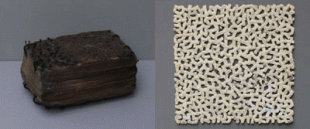 La galerie présente des œuvres de deux artistes Japonais qui travaillent uniquement avec du papier. Mamoru Hamada est né en 1945 et vit au Japon. Ses œuvres pourraient avoir pour titre « arborescences ». C'est qu'ici nous parle de la présence du végétal et de sa puissance presque infinie. Le papier n'est pas n'importe quel papier; il est pris dans des livres pour enfants. Les feuilles ne sont donc pas vierges, mais les signes graphiques dont elles sont très vite rendus indéchiffrables par le traitement particulier qu'elles reçoivent de l'artiste. Les signes graphiques qui viennent des livres utilisés n'ont pas disparu. Mais, dispersés, émiettés par quelque soudain cataclysme, ils n'ont plus d'existence qu'à l'état de vestiges muets d'un monde qui ne fut qu'une erreur. Leur beauté s'est réfugiée dans leurs formes et dans leurs couleurs. Dans les œuvres de Hamada, c'est une sagesse primordiale, venue des temps immémoriaux, qui est portée jusqu'à nous, celle qui peut se faire entendre dans les murmures de la forêt ou se laisser surprendre dans le clair-obscur changeant des frondaisons. Shigeo Shinjo est né en 1945 et vit en France. Il présente des œuvres "Love letters", les feuilles de papier empilées, serrées pour former un livre. Elles sont clouées et brûlées comme s'il fallait à jamais en empêcher la lecture. Ces œuvres, que l'on peut trouver énigmatiques, naissent en fait d'un drame intérieur, dans lequel une volonté s'oppose à elle-même, cherchant, dans la fièvre de la création, à la fois à retenir le temps et à l'abolir; peut-être avec le secret espoir de voir le temps rejoindre l'éternité dans la jouissance de l'instant présent. Autrement, il présente les oeuvres de papier perforées par le clou ou les crayons colorés. On le voit, l'art du paradoxe chez Shinjo a des affinités avec l'art du Haïku. Il s'agit d'un art qui sait être profond en cultivant la simplicité, ici, et comme par magie, le papier, ce matériau en apparence très pauvre, prend une dimension métaphysique.